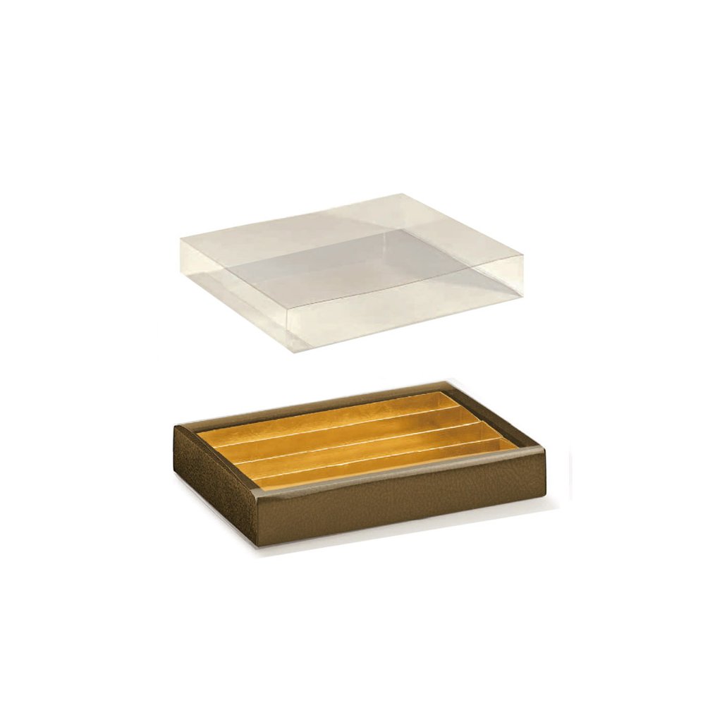 Velice elegantní papírová krabička na pralinky v hnědé barvě s jemným reliéfním vzorem imitace kůže. Dodáváno s průhledným plastovým obalem.