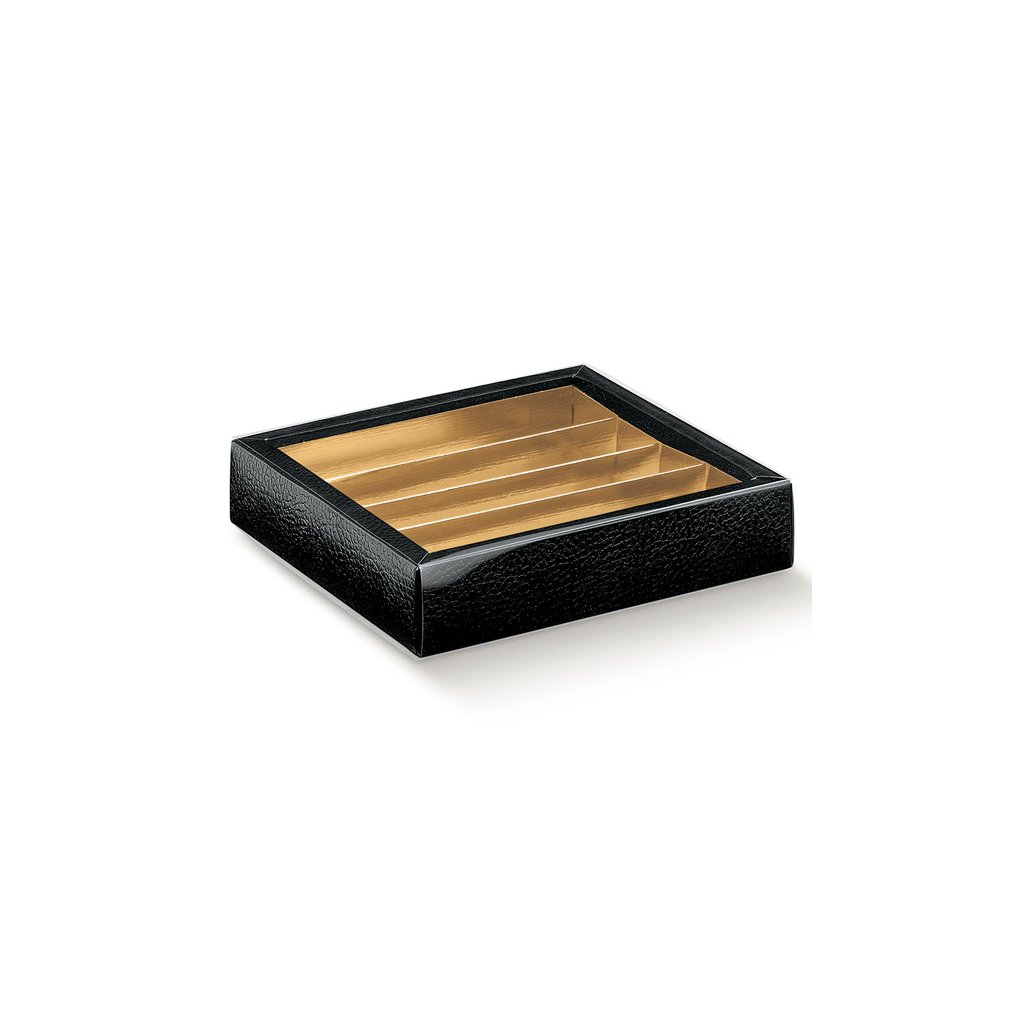 Velice elegantní papírová krabička na pralinky s plastovým obalem v barvě černé kůže.