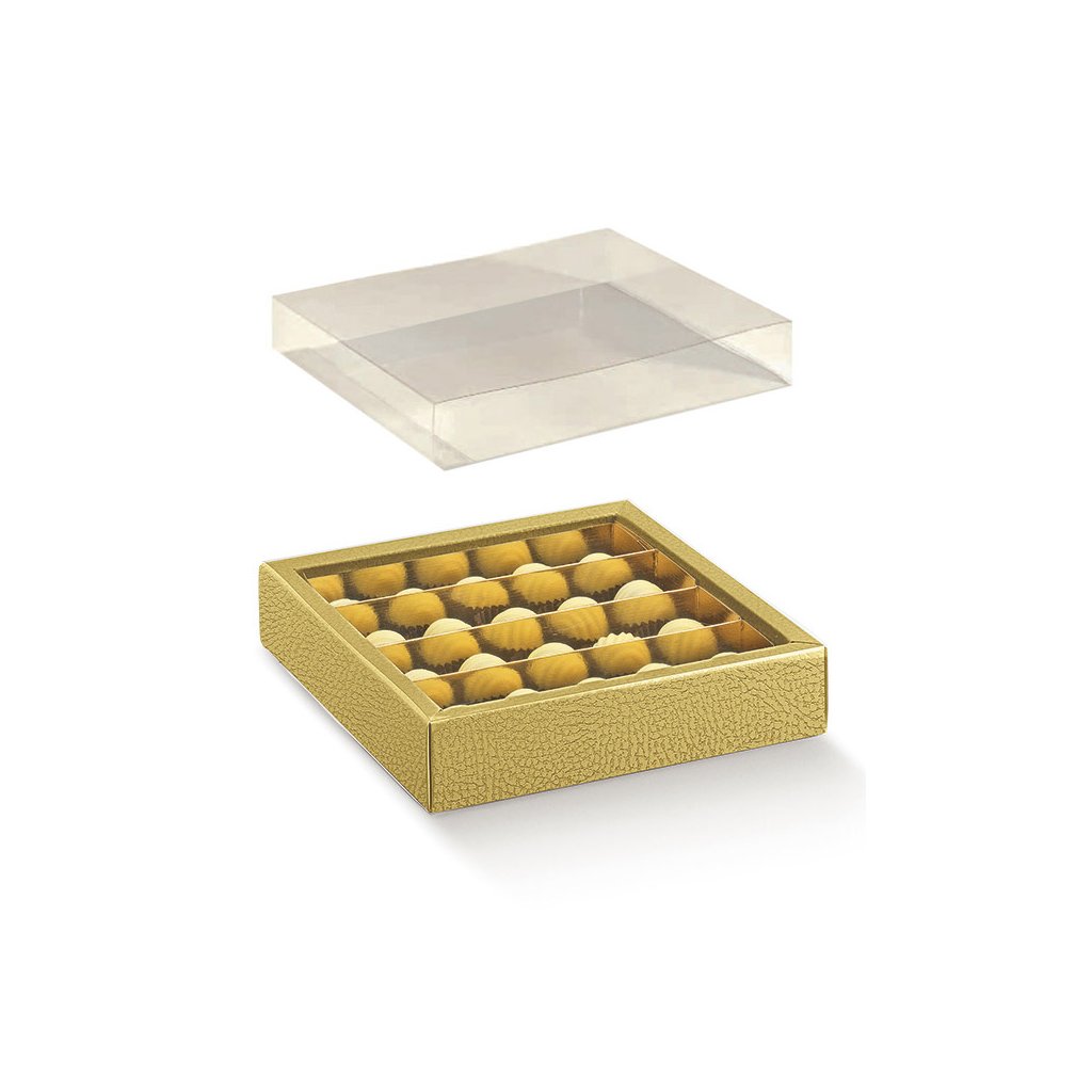 Velice elegantní papírová krabička na pralinky ve zlaté barvě s jemným reliéfním vzorem imitace kůže. Dodáváno s průhledným plastovým obalem.