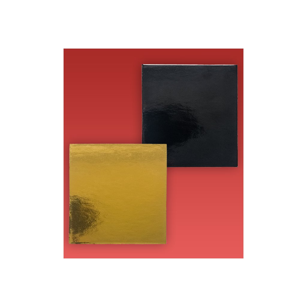 Papírová dortová podložka s hladkým okrajem, čtvercová, velmi pevná. Potažená oboustranně zlatou/černou folií odolnou proti vlhku. Ideální jako nosič zákusků.