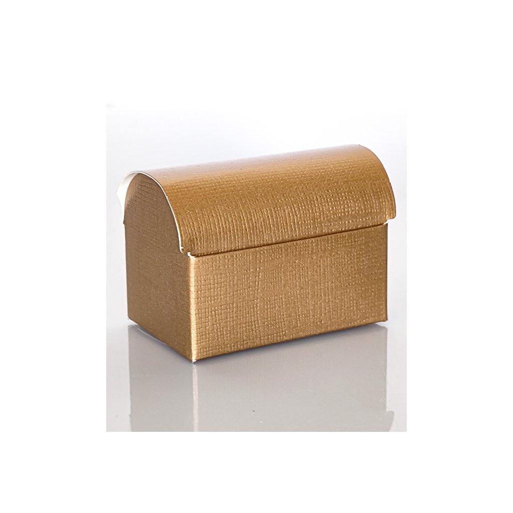 Papírová krabice ve formě truhly z pevného kartonu ve zlaté barvě s jemným kruhovým reliéfem.