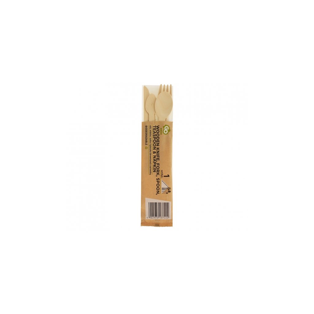 Dřevěné příbory v samostatném balení, obsahující 1x lžičku, 1x lžíci, 1x vidličku, 1 x nůž a ubrousek. Materiál dřevo a papír. Balení - 1 kompletDoplňkové parametry