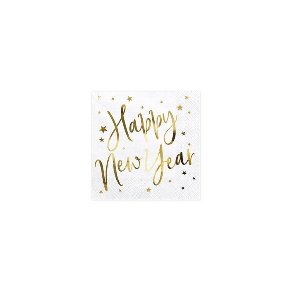 Ubrousky z bílého papíru se zlatým kovovým potiskem hvězd a nápisem Šťastný Nový Rok,rozměry při rozložení cca 33 x 33 cm, rozměry po skládání cca 16,5 x 16,5 cm.(1 balení / 20 ks.)Doplňkové parametry