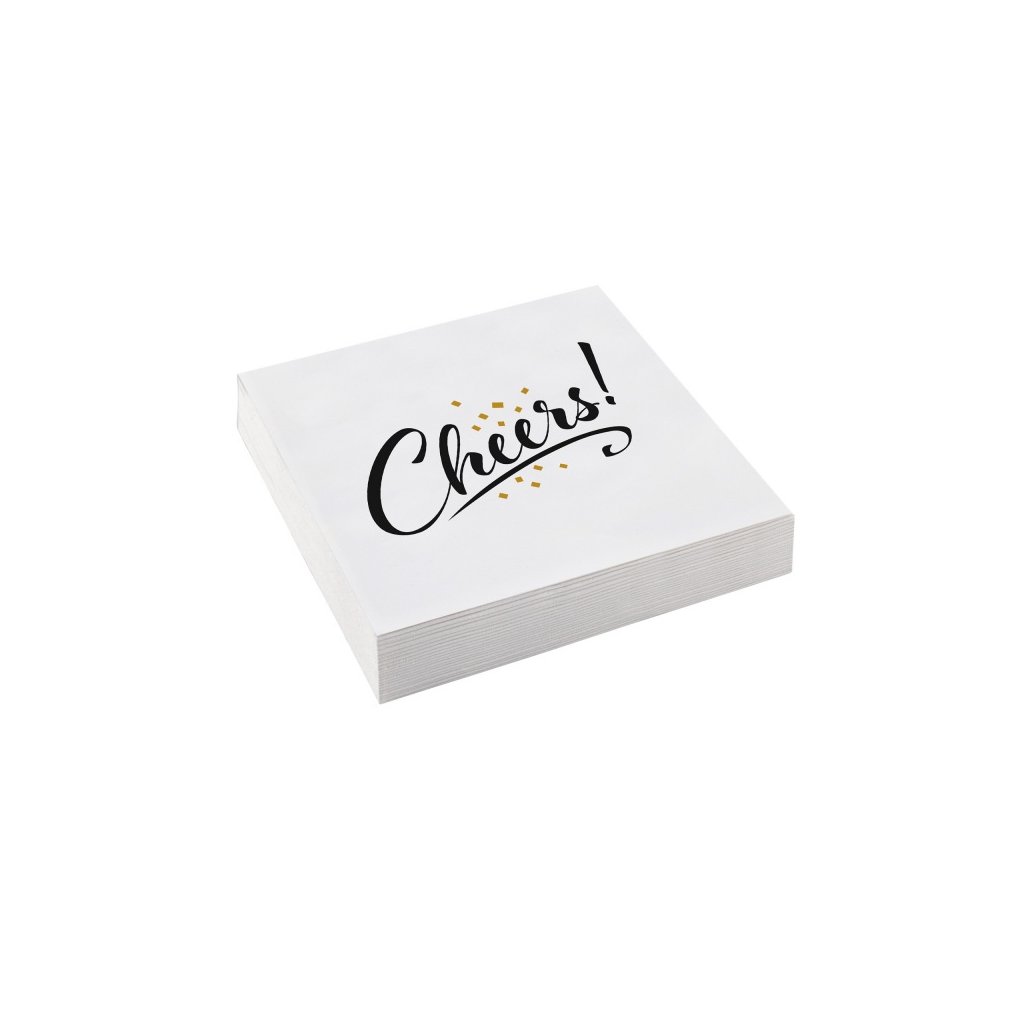 Papírové ubrousky se zlatými konfety a černým nápisem Cheers se skvěle hodí na narozeninové party a oslavy i jako dekorace Silvestra. Rozměr: 33 x 33 cm. Balení: 20 ks.Doplňkové parametry