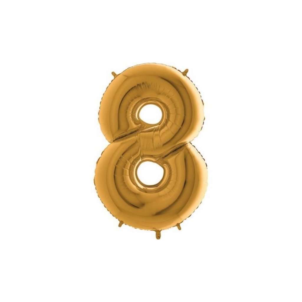 Foliová číslice 8 ve zlaté barvě. Balonek zůstane plně nafouknutý 3 až 5 dní, ale lze jej opakovaně dofukovat přes brčko.
