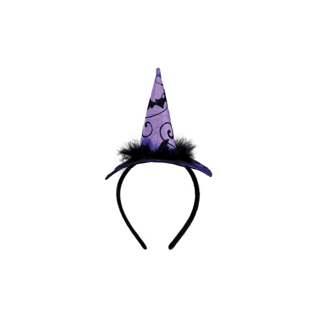 Čelenka - čarodějnický klobouk fialový. Ozdobná čelenka do vlasů vypadá jako by vám malý čarodějnický klobouk padl jako ulitý, hodí se jako doplněk ke kostýmu na Halloweenskou party čarodějnickou noc nebo jen jako doplnění outfitu na party. Balení: 1 ksDoplňkové parametry
