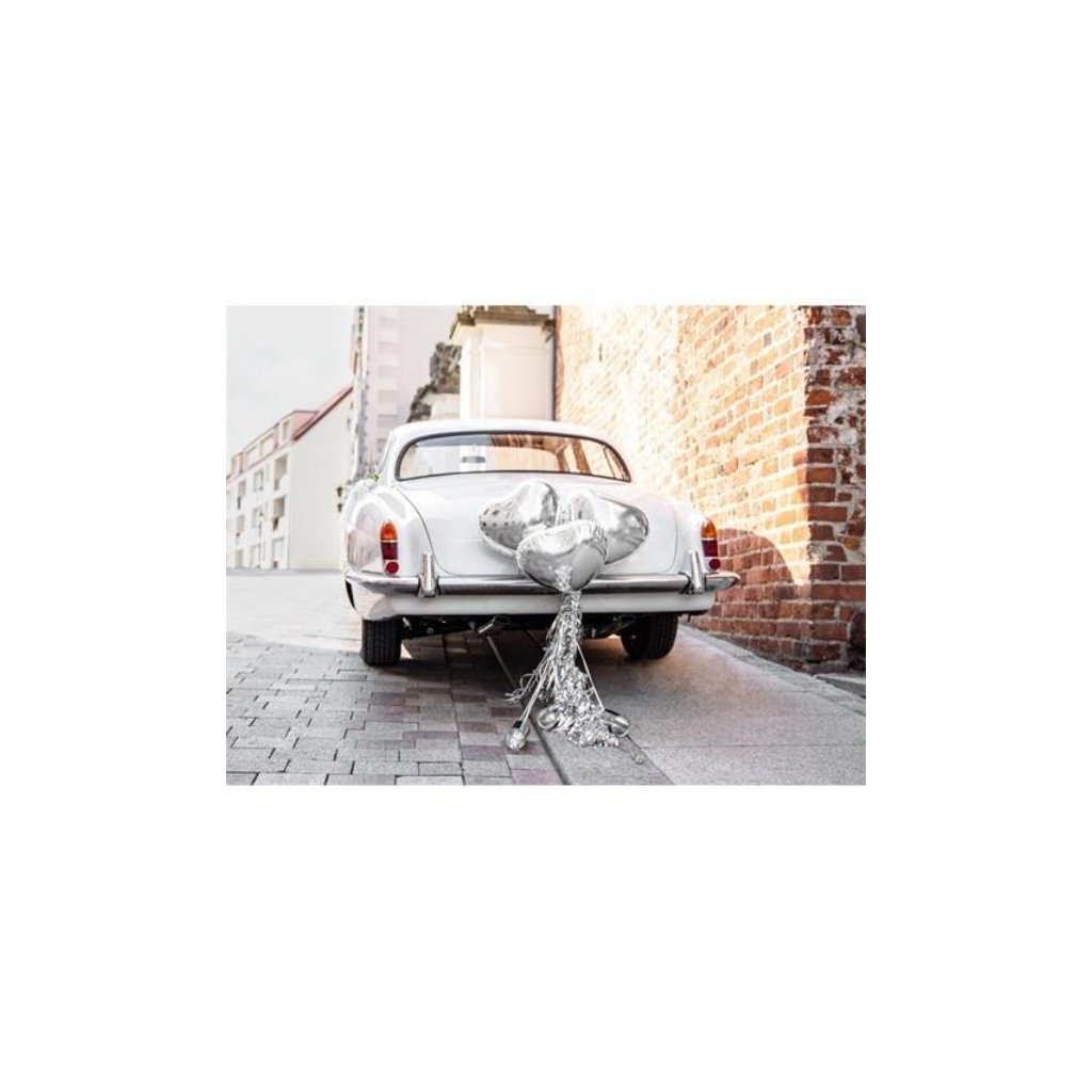 Dekorační sada na auto vhodná na dekoraci svatebního automobilu. Krásná dekorace, kterou oslníte všechny hosty na vaší party. Tímto jednoduchým doplňkem, dotáhnete každou svatbu k dokonalosti. Sada obsahuje: girlandu se stříbrnými střapci plechovky za auto 3x stříbrný foliový balonek srdce o velikosti 45 cm vlasec 12 mDoplňkové parametry