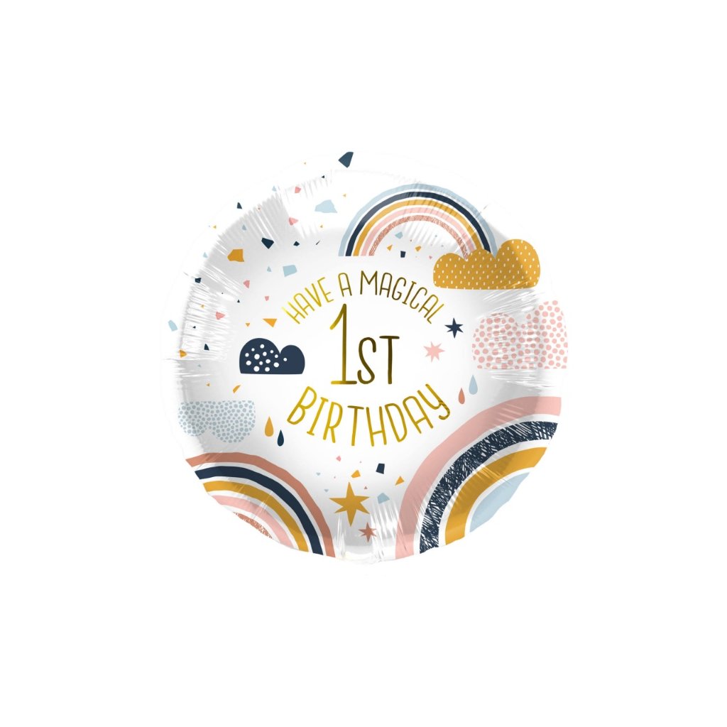 Foliový balonek s nápisem 1st Birthday a obrázkem duhy. Vhodné jako doplněk dekorace na oslavu narozenin nebo party Balonek lze nafouknout vzduchem i heliem. Při nafouknutí heliem vydrží plně nafouklý cca 3 až 5 dní, poté se začne pomalu vyfukovat. Balonek je vyroben z recyklovatelných materiálů a je 100% recyklovatelný. Velikost: 45 cm. Balení: 1 ks.Doplňkové parametry