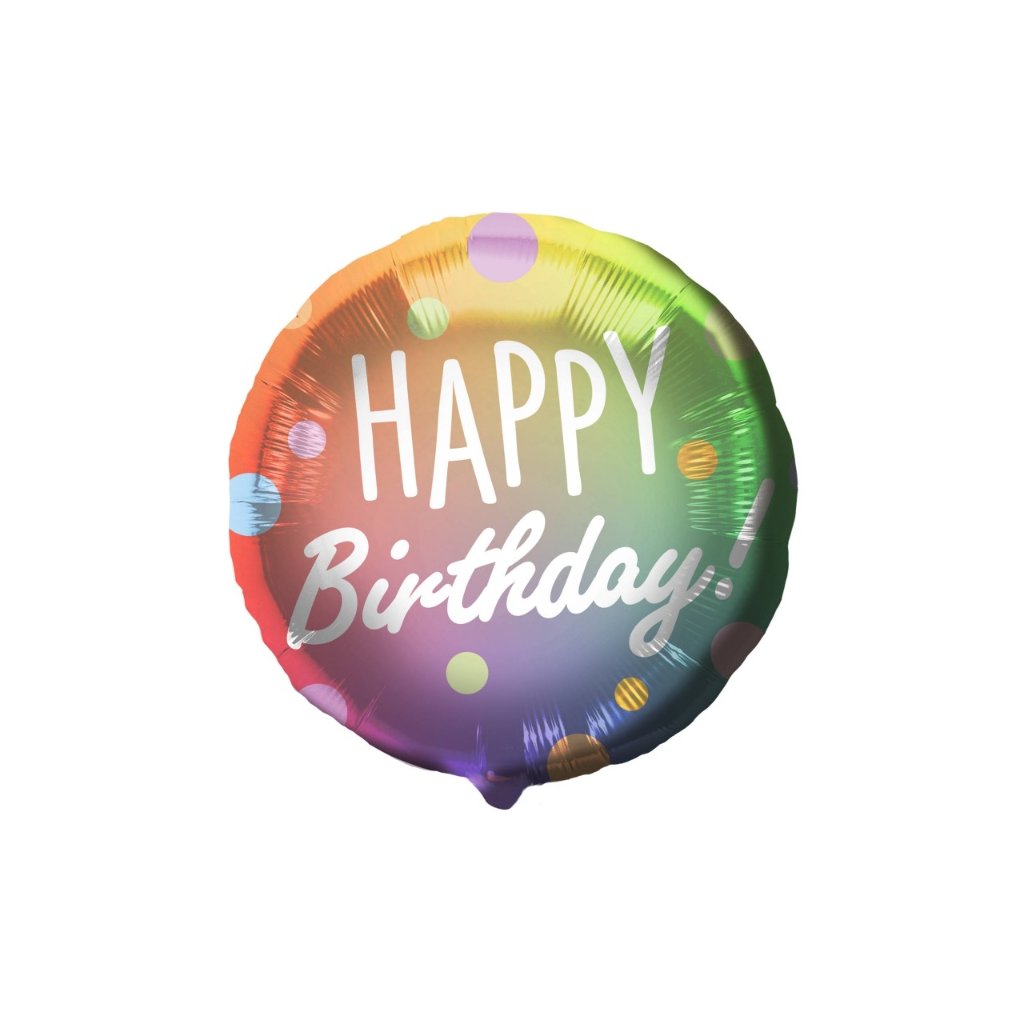 Foliový balonek Happy Birthday - holografické tečky 45 cm . Tento balónek je perfektní dekorační doplněk na oslavu narozenin nebo party. Hodí se také jako malý dárek. Balonek lze nafouknout vzduchem i heliem. Při nafouknutí heliem vydrží plně nafouklý cca 3 až 5 dní, poté se začne pomalu vyfukovat. Balonek je vyroben z recyklovatelných materiálů a je 100% recyklovatelný. balení 1 ks velikost 45 cmDoplňkové parametry