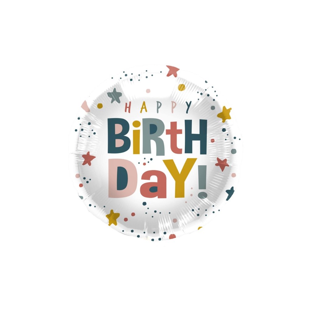 Foliový balonek Happy Birthday - hvězdičky a tečky 45 cm. Tento balónek je perfektní dekorační doplněk na oslavu narozenin nebo party. Hodí se také jako malý dárek. Balonek lze nafouknout vzduchem i heliem. Při nafouknutí heliem vydrží plně nafouklý cca 3 až 5 dní, poté se začne pomalu vyfukovat. Balonek je vyroben z recyklovatelných materiálů a je 100% recyklovatelný. balení 1 ks velikost 45 cmDoplňkové parametry