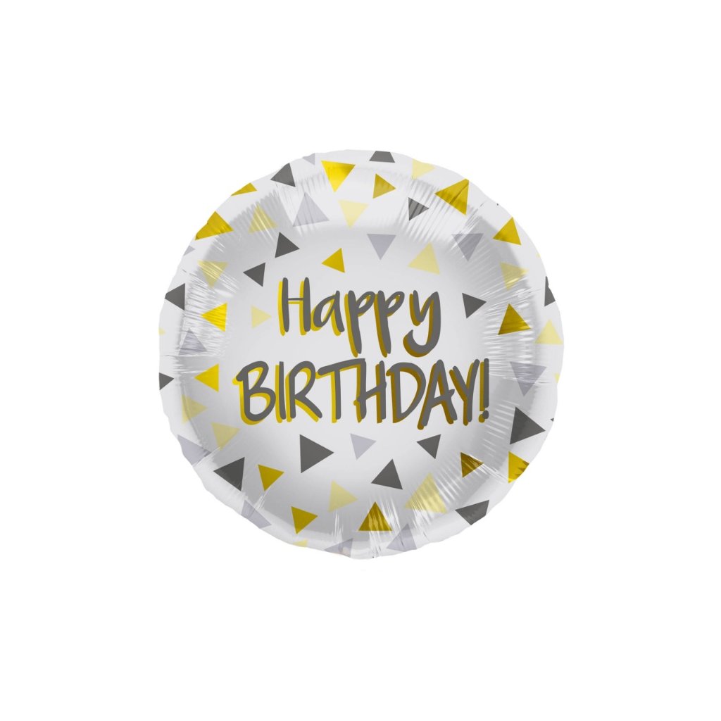 Foliový balonek s nápisem Happy Birthday a s motivem trojúhelníků, který můžete použít například jako dekoraci při oslavě, party nebo jako dárek pro oslavenkyni nebo oslavence. Balonek je vhodný pro plnění vzduchem i heliem. Velikost: 45 cm. Balení: 1 ks.Doplňkové parametry