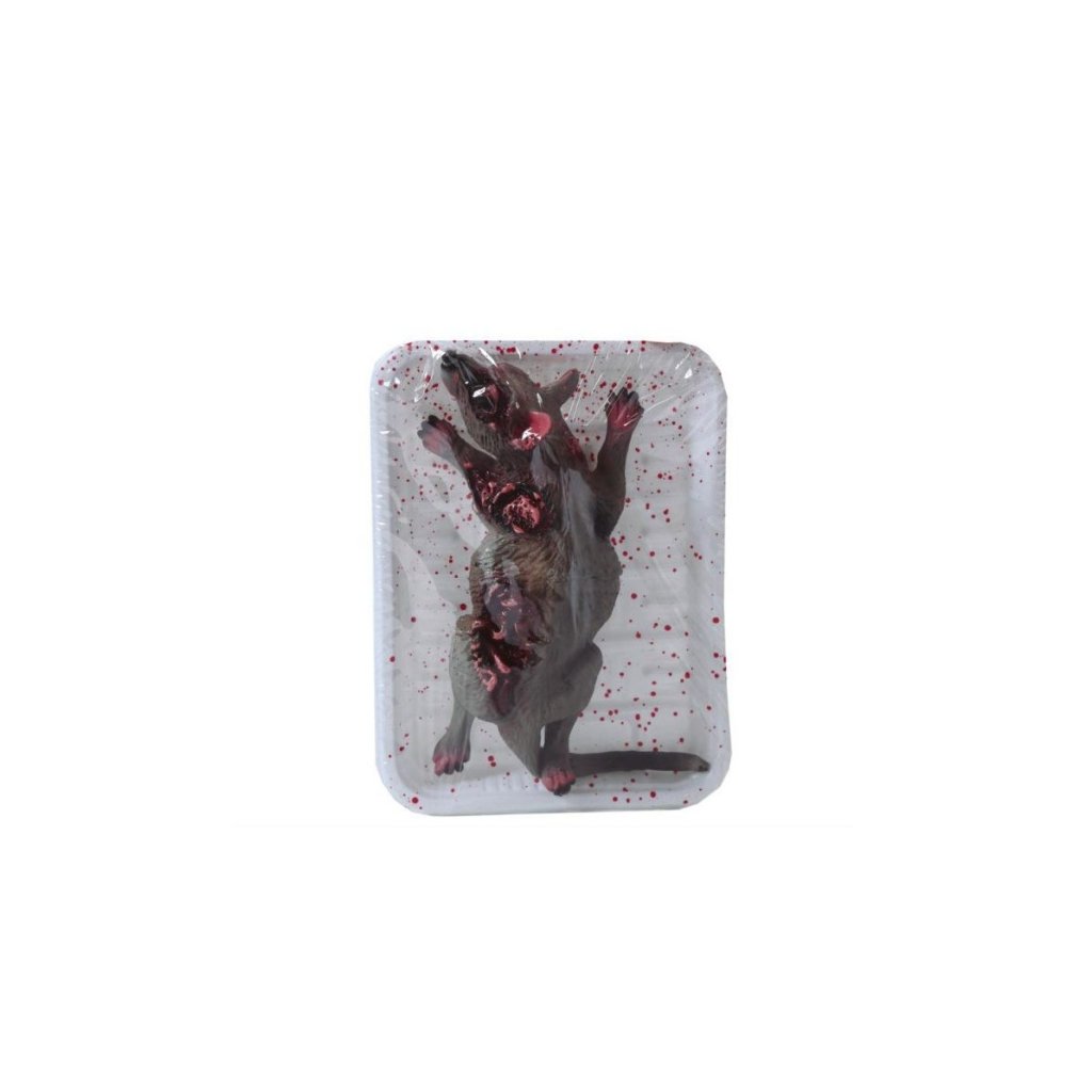 Halloweenská dekorace - mrtvá krysa na tácku /BP