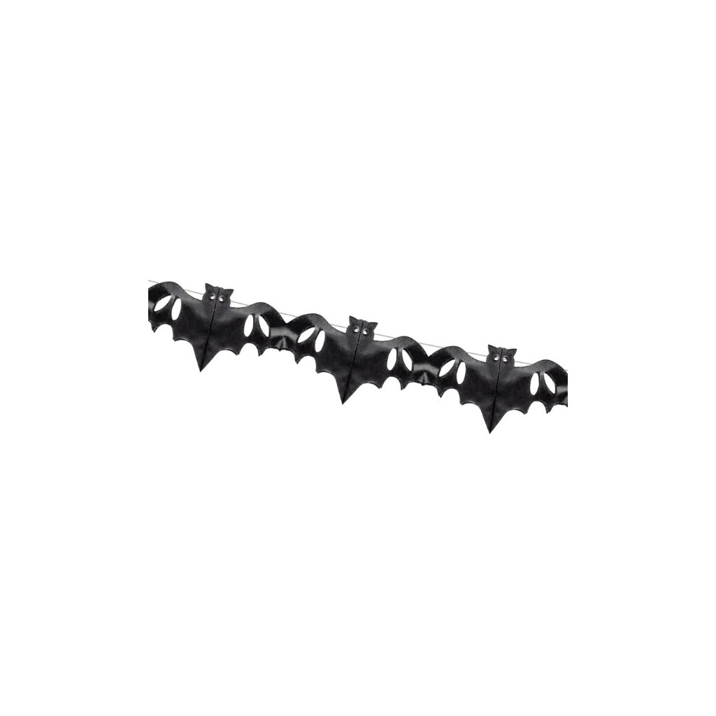 Papírová girlanda netopýři v černé barvě, vhodná na zavěšení při halloweenské akci. Rozměr: 4 m.Doplňkové parametry