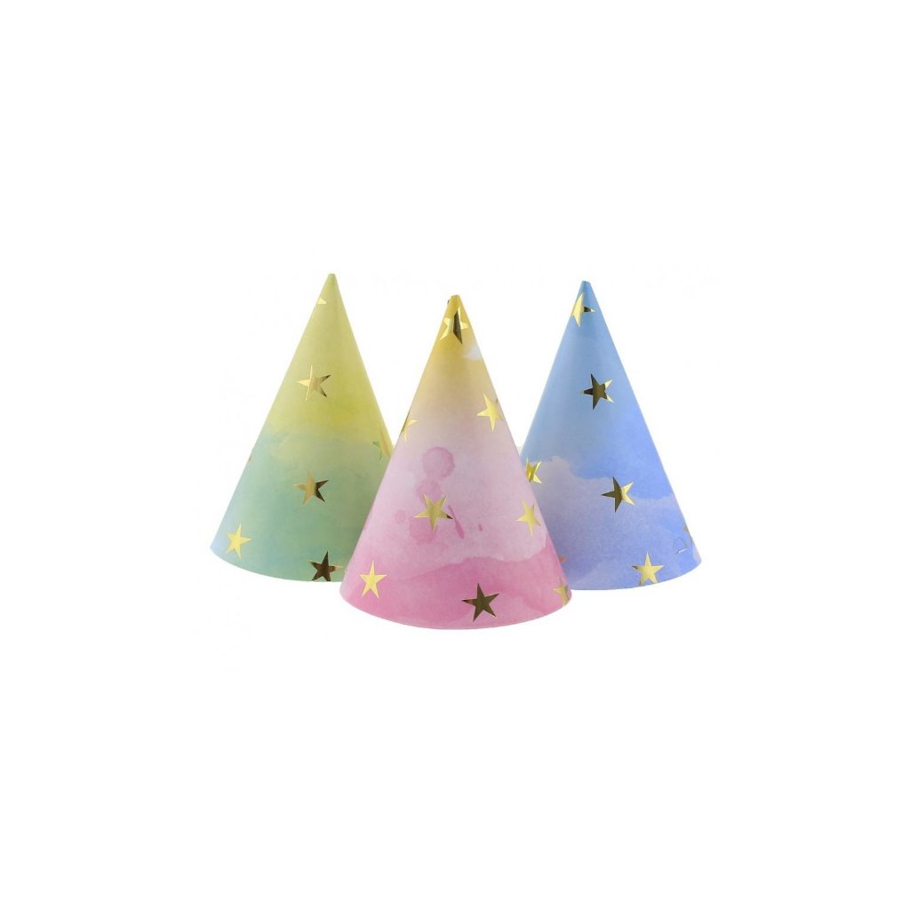 Papírové čepičky se zlatými hvězdami jsou skvělou volbou aby každý zúčastněný měl na sobě věc spjatou s oslavou. Hodí se na jakoukoliv party nebo oslavu Balení: 6 ks.Doplňkové parametry