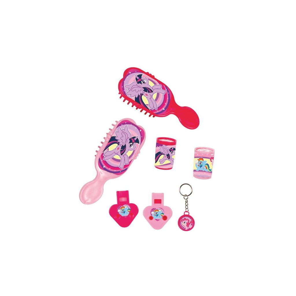 Zábavný party set dárečků na tématickou party My little Pony. Počet: 6 x 4 sady (hřeben, kaleidoskop, píšťalky, klíčenky). Balení: 24 ks.Doplňkové parametry