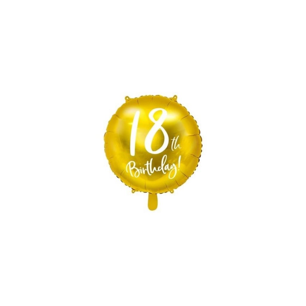 Foliový balonek ve zlaté barvě s bílým nápisem 18th Birthday. Vhodný dárek na narozeniny nebo jako výzdoba na oslavu.
