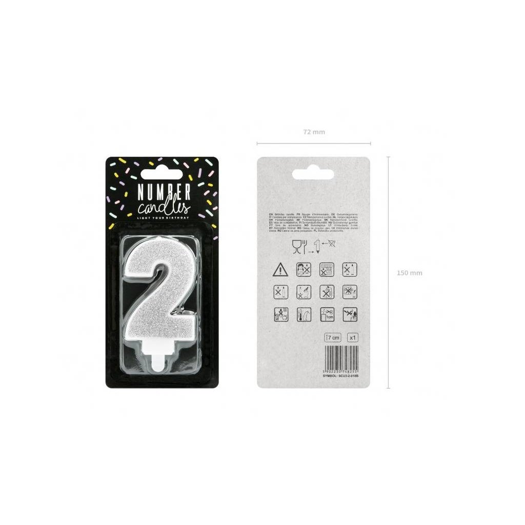 PARTY DECO Svíčka číslice "2" stříbrná 7 cm 1 ks