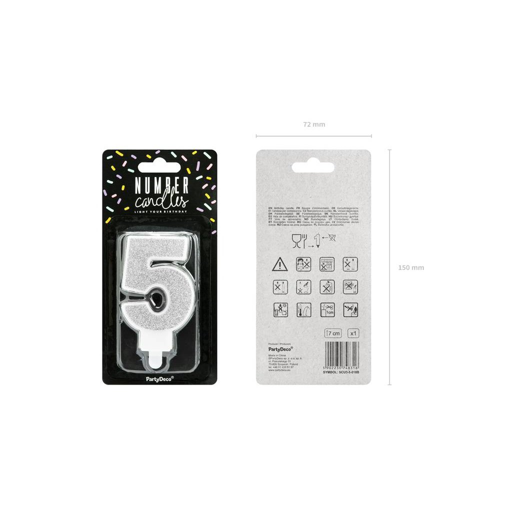 PARTY DECO Svíčka číslice "5" stříbrná 7 cm 1 ks