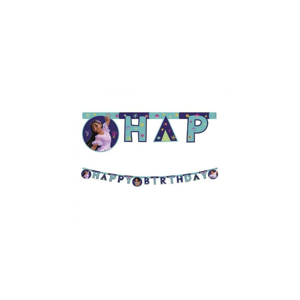 Narozeninový nápis v tématu filmu Encanto. Obsahuje nápis Happy Birthday v barevném tématu Encanto a dekorační prvky postav z filmu. Je vyrobený z papíru a jeho délka je 200 cm. Nápis je již sestavený. Materiál: PapírVelikost: 17 x 200 cmBalení: 1 sadaObchodní balení: AnoDoplňkové parametry