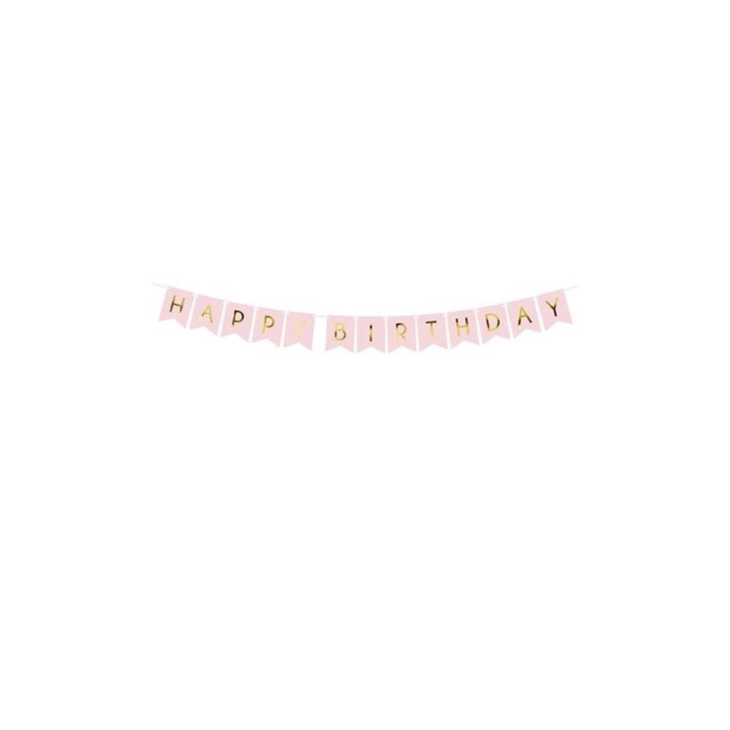 Girlanda Happy Birthday z vlaječek v růžové barvě se zlatým textem vhodná na narozeninovou party nebo oslavu holčičky. Rozměr: 15 x 175 cm. Balení: 1 ks.Doplňkové parametry