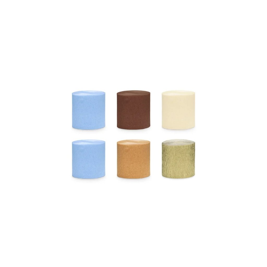 Sada krepových stuh - béžovo modrá 5 cm x 10 m. Papírové stuhy na výrobu mašlí a různých dekorací. Lze je použít například na svatbě, oslavě narozenin, křtinách při různém dekorování nebo jako stuhu na dárek či kytici. Stuhy lze také kombinovat jako netradiční svatební výzdoba sváteční tabule. Velikost: 5 cm x 10 m Material: papír Balení: 1 ks.Doplňkové parametry