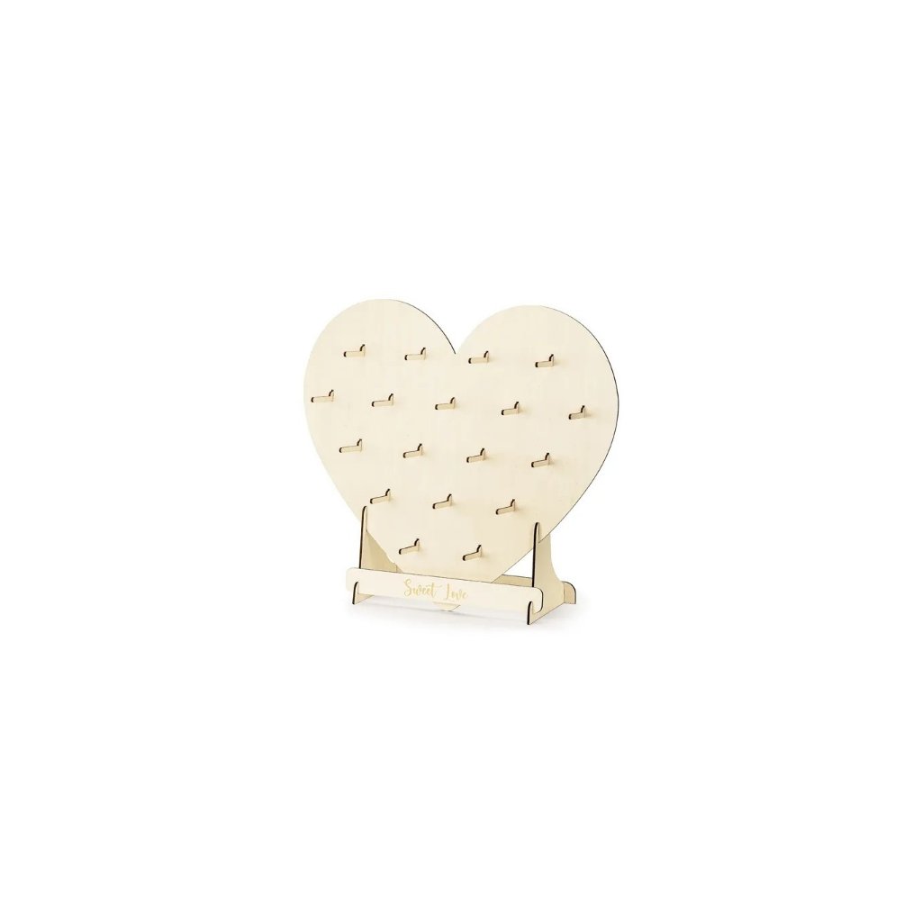 Dřevěný stojan ve tvaru srdce na pověšení donutů s ozdobným nápisem Sweet Love. Stojan je ideální pro svatební candy bary, firemní snídaně, narozeninové oslavy v nature stylu, svatby v přírodě. Má moderní rustikální vzhled, je vyroben z přírodního dřeva. Dřevěná stěna je celkem pro zavěšení 18ks donutů a je určena pro vlastní montáž. Rozměr 65 x 59 cmDoplňkové parametry