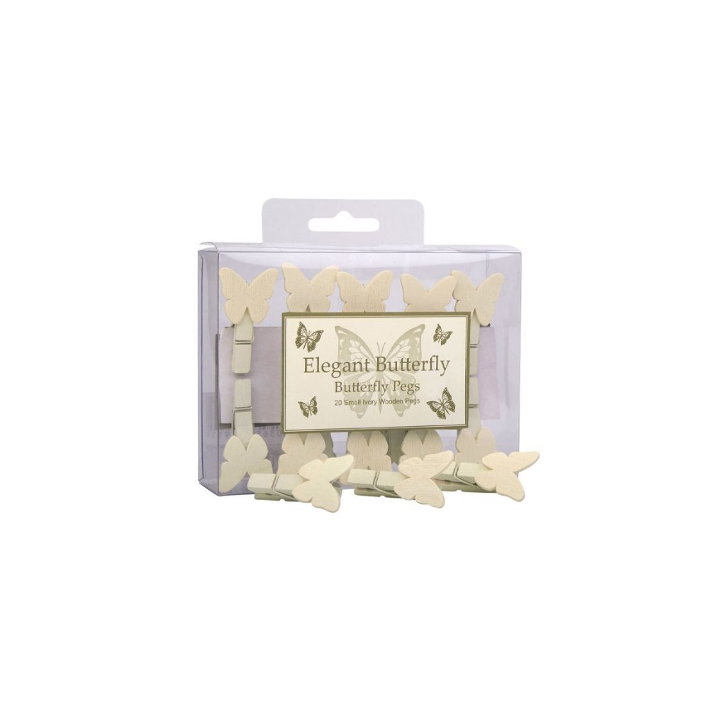 Krémové dřevěné kolíčky. Tyto všestranné kolíčky s motivem motýlka představují snadný způsob, jak vylepšit vaši svatební výzdobu. Použijte například pro přichycení menu na ubrousky nebo pro připevnění koordinačního štítku na stůl. Balení: 20 ksDoplňkové parametry