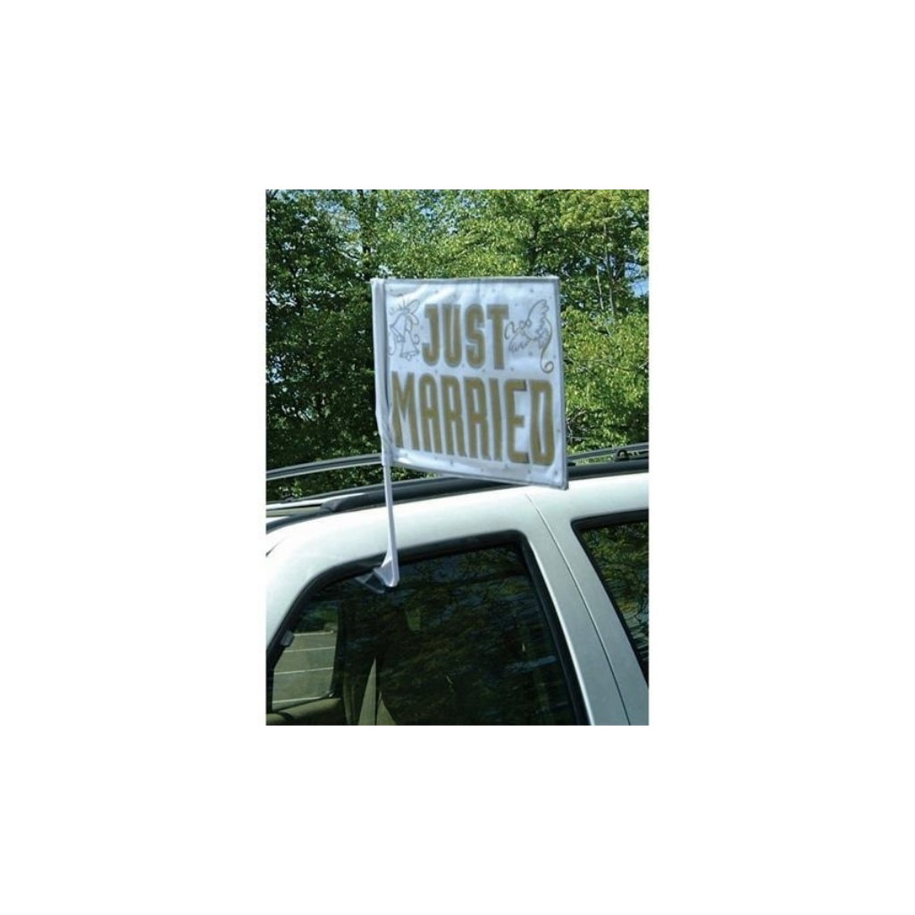 Svatební vlaječka za okno auta s nápisem Just married. Ať každý ví , že je to váš den! Tímto jednoduchým dekoračním doplňkem, vyzdobíte například prostor místnosti ale hodí se především na dekorace automobilů. Rozměr: 35,5 x 45,7 cm. Balení: 1 ks.Doplňkové parametry