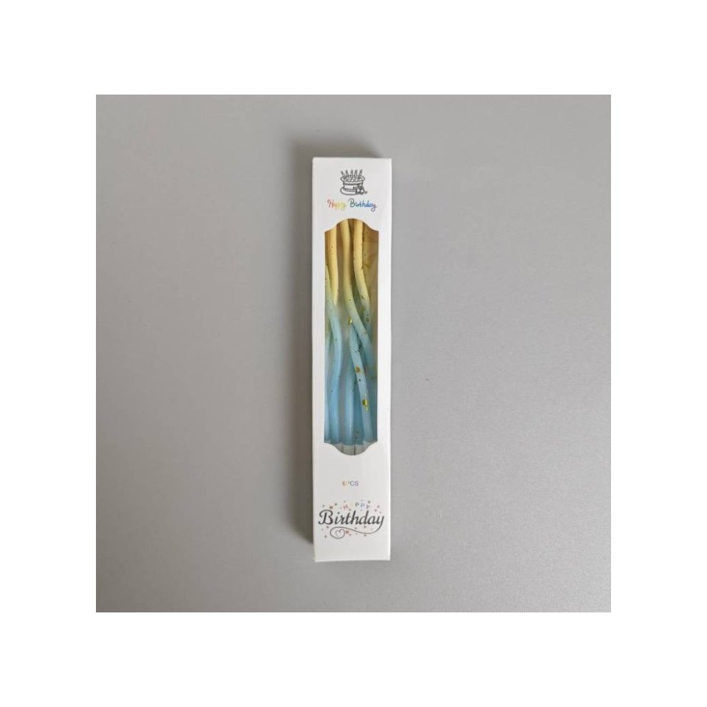 Svíčky spirálové modro-žluté se zlatým zdobením (6 ks) ♡