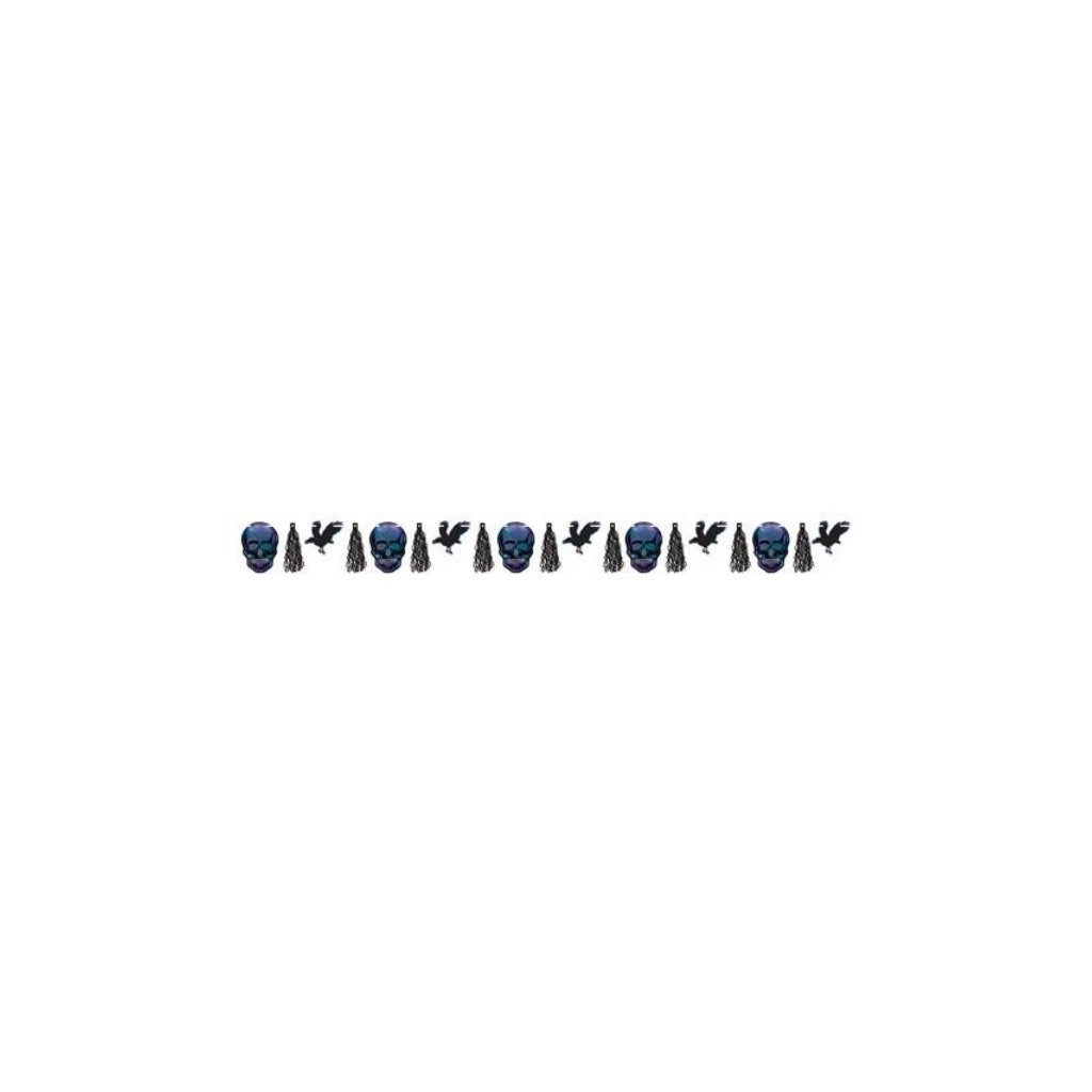 Závěsná girlanda na Halloweenský večer s motivem havranů, lebky a třásní Goblet Skeleton. Rozměr: 300 cm. Balení: 1 ks.Doplňkové parametry