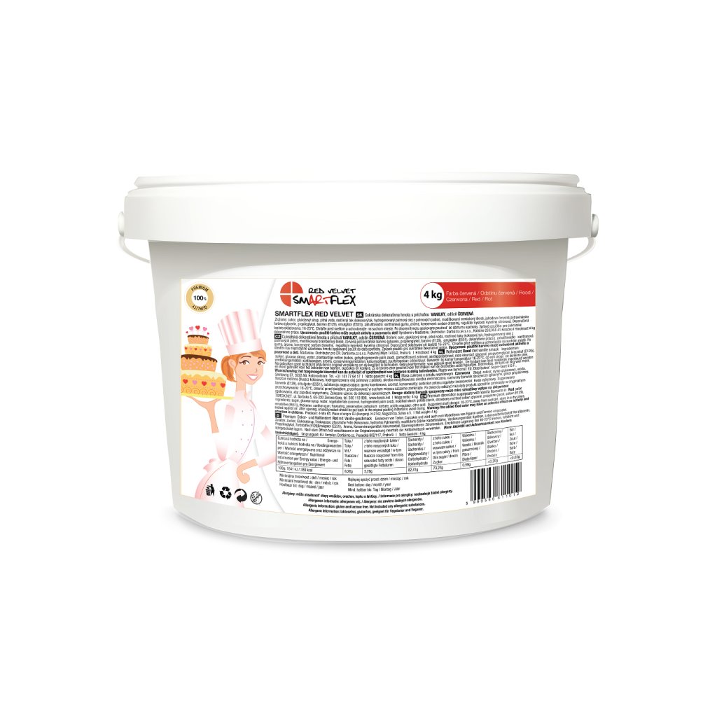 Proč zvolit barvenou hmotu Smartflex Velvet? - extra pružná - měkká a poddajná - rychle drží tvar - nesesedá - netrhá se - lehká chuť a vůně - sytá barva Červená, extra pružná hmota s vynikajícími vlastnostmi uspokojí i toho nejnáročnějšího zákazníka. Hodí se zejména k potahování dortů a modelování figurek. Je měkká a poddajná, ale skvěle a rychle drží tvar a nemá tendenci sesedat ani při tvorbě vyšších a složitějších modelací. Při potahování se netrhá a lehce přilne ke korpusu. Její lehká vanilková chuť a vůně skvěle doplní delikátnost vašeho výrobku. Efektivní a rychlé použití Sytý odstín bez namáhavého barvení je vždy připraven k použití. Doporučené použití Pod potahovací hmotu patří krém s nízkým obsahem vody. Vhodné jsou tedy např. máslový krém, krém z másla a moučné kaše, pudinkový krém s máslem nebo ganache. Nevhodné jsou šlehačkové krémy s mascarpone, tvarohem, zakysanou smetanou či jogurtem. Jelikož fondánové hmoty obsahují především cukr a ten ve spojení s vodou obsaženou ve jmenovaných surovinách způsobí, že se potah začne rozpouštět a tekutina pak po obvodu dortu vytéká ven. Hmota by měla mít pokojovou teplotu. Odřízněte požadované množství hmoty a propracujte, dokud nebude vláčná a elastická. Je-li hmota tužší konzistence, můžete ji dát na 5–10 vteřin ohřát do mikrovlnné trouby. Pokud chcete hmotu světlešího odstínu, smíchejte ji s bílým Smartflex Velvetem a důkladně propracujte. Poté hmotu vyválejte na cca 4 mm silný plát. Aby se hmota nelepila, lze ji podsypávat moučkovým cukrem nebo škrobem. Velikost plátu by měla být o něco větší, než je průměr dortu plus výška dortu. Jeho přemístění na dort můžete udělat třemi způsoby. Plát buď podeberte rukama, nebo namotejte na váleček nebo pokud ho vyválíte na silném igelitu či silikonové podložce, zvedněte ho i podkladem, otočte ho na připravený korpus a igelit nebo silikon stáhněte. Pak už jen uhlaďte pomocí cukrářských žehliček a odřízněte přebytečnou hmotu. Hmotu uchovávejte v igelitových sáčcích a uzavřených nádobách, aby nevysychala a tudíž netvrdla. Hmota je bezlepková.Složení, co obsahuje produkt - Smartflex Red Velvet Vanilka 4 kg pro cukrářské účely: