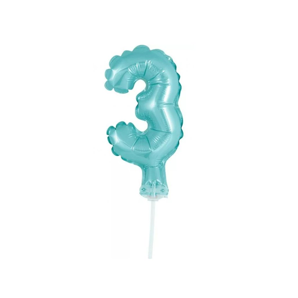 Modrá nafukovací číslice 3 na tyčce o velikosti 13 cm. Ozdoba na dort a další dezerty.