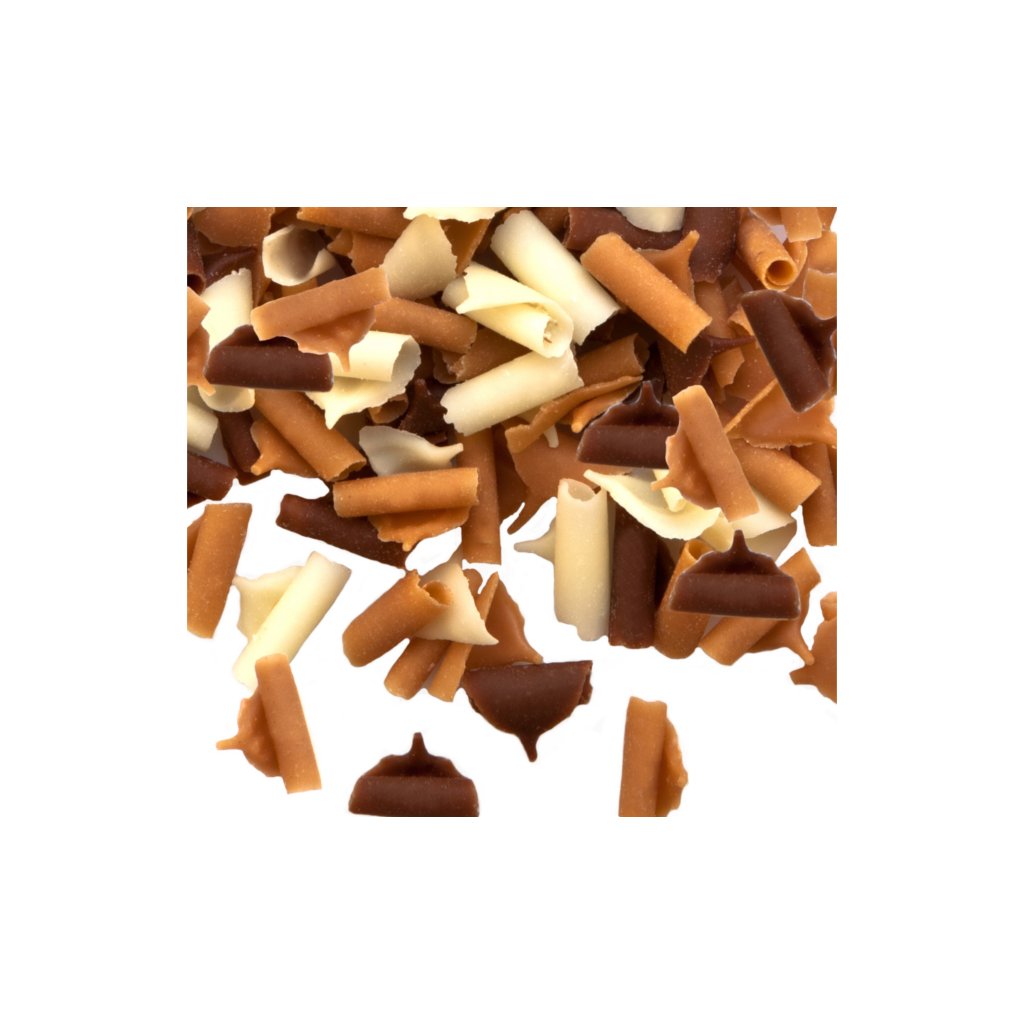 Lahodné čokoládové hobliny mléčné, bílé a karamelové, které jsou zároveň i dekorací na váš moučník. Rozměr: 9 x 5 mm.