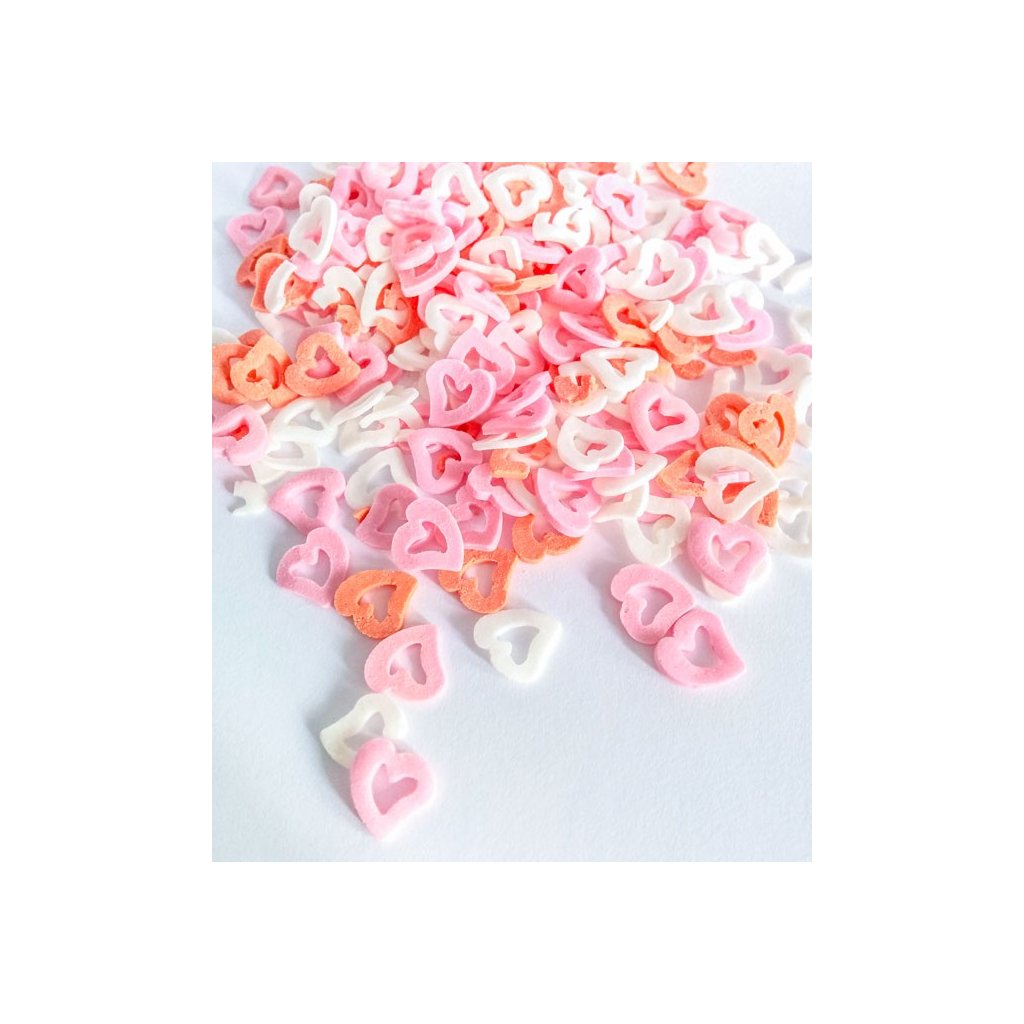 Cukrová barevná srdíčka. Používají se na dekoraci dortů a zmrzlinových pohárů.