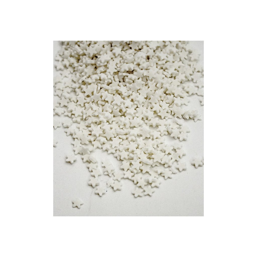 Cukrové hvězdičky bílé barvy. Jedlá dekorace vyrobená na cukrové a škrobové bázi vhodná k dekoraci dekoraci dortů a zmrzlinových pohárů.