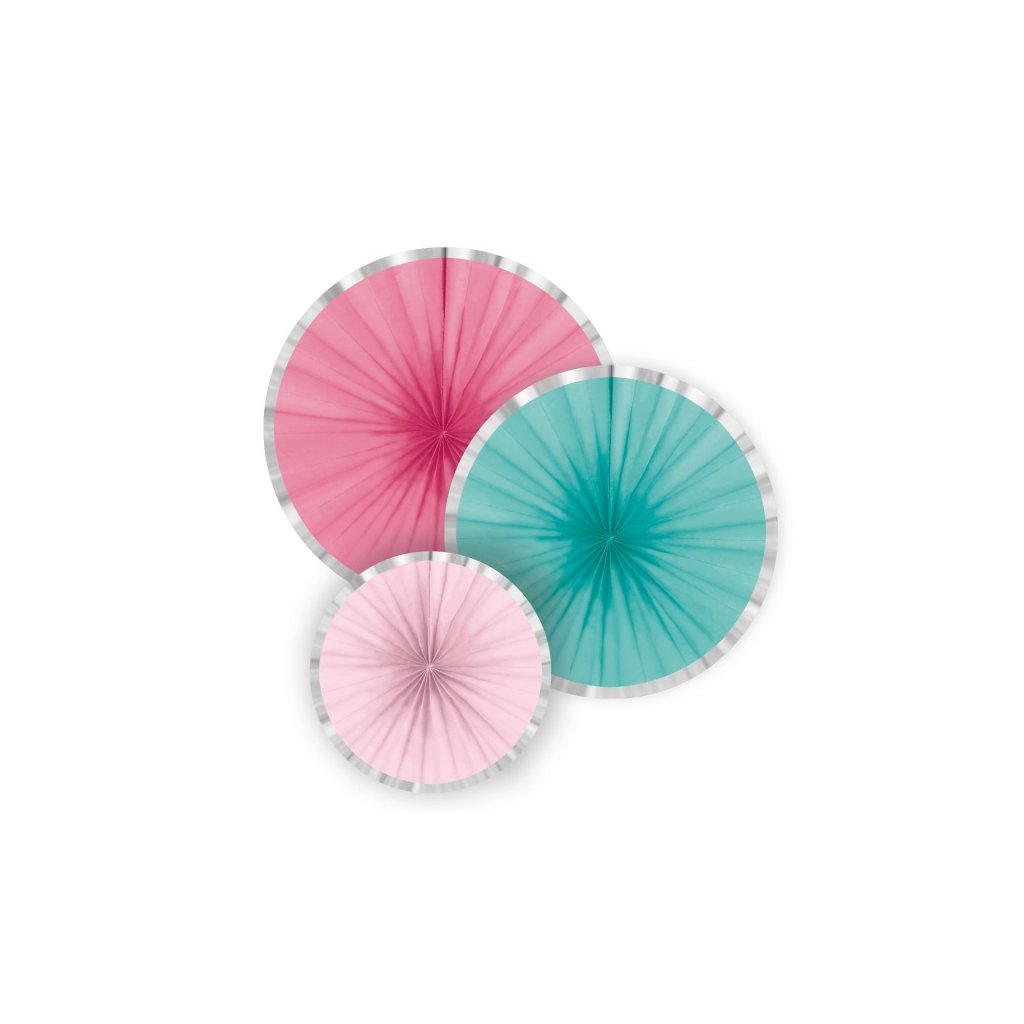 Dekorační závěsné rozety v Pudrově růžové a tyrkysové barvě zdobené stříbrným okrajem. Rozety jednoduše roztáhnete a připevníte konce k sobě. Pak už je stačí jen připevnit kam budete potřebovat a dozdobit tak interiér každé party nebo oslavy narozenin. Rozměr: 16, 28, 35 cm. Balení: 3 ks. Rozměr: 16, 28, 35 cm Balení: 3 ks.Doplňkové parametry