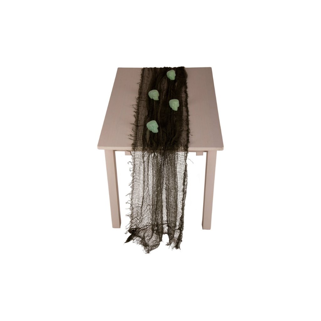 Halloweenská dekorace - stolová šerpa s lebkami, které ve tmě svítí. Dekorace na stůl v podobě černé síťované šerpy se čtyřmi lebkami, které ve tmě září.Děsivý doplněk na každé Halloweenské party, nebo tématické party. Balení: 1 ks stolová šerpa 4 ks lebkyDoplňkové parametry
