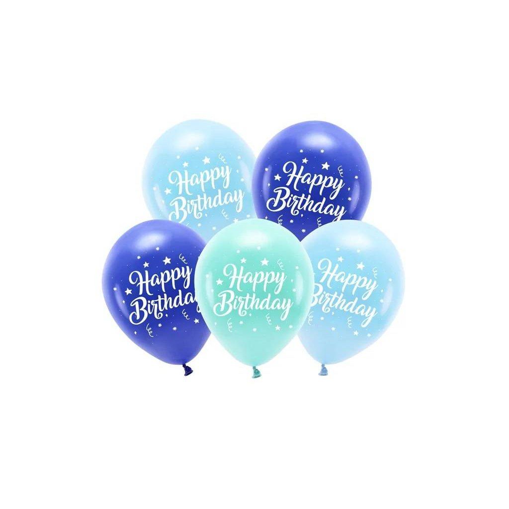 PartyDeco Eco balónky modré a tyrkysové Happy Birthday (5 ks) ▹ /BP