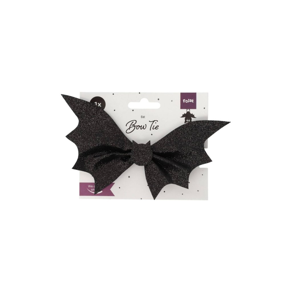 Motýlek na gumičce - netopýr. Motýlek na gumičce ve tvaru netopýra ozdoben glitry, se kterým si užijete focení ve fotokoutku jak vy tak i vaši přátelé. Hodí se na halloween ale i jako doplněk k vašemu slavnostnímu outfitu na silvestrovskou party nebo jako doplněk ke kostýmu. Barva: černá lesklá Balení: 1 ks.Doplňkové parametry