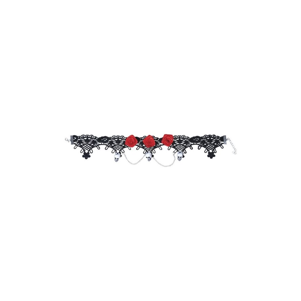 Náhrdelník - lebky a ruže - Day of the dead. Náhrdelník s aplikací lebek a růží v motivu Dia de los Muertos, hodí se jako doplněk ke kostýmu na Halloweenskou party nebo jen jako doplnění outfitu na party. Balení: 1 ksDoplňkové parametry