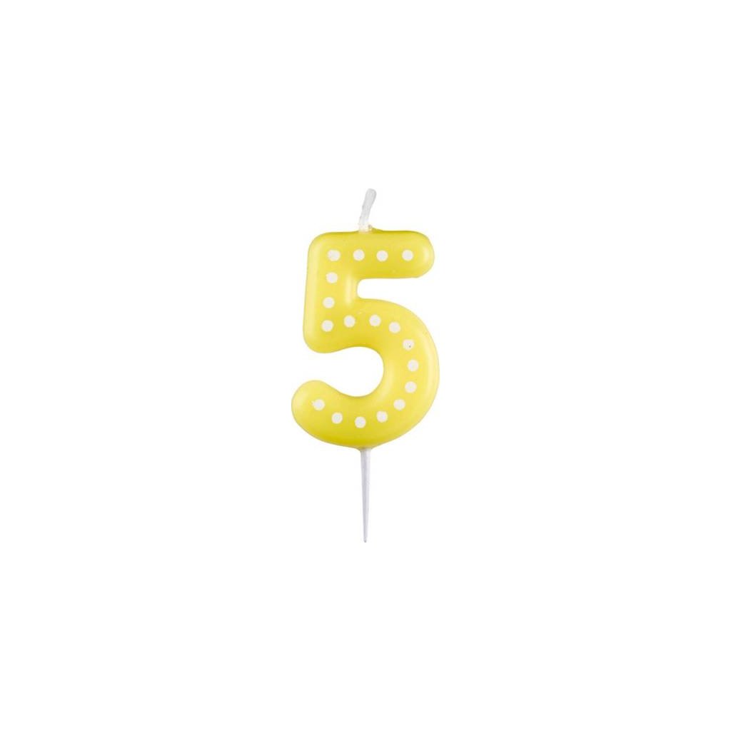 Narozeninová svíčka ve tvaru číslice 5 s puntíky. Výška 6,5 cm.Doplňkové parametry