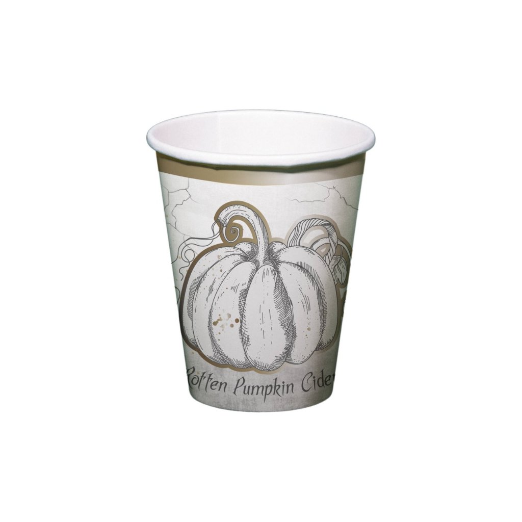 Papírové kelímky Creepy Halloween 8 ks. Papírové kelímky na Halloweenskou party s motivem dýně ladící ke kolekci Creepy Halloween. Po oslavě stačí kelímky vzít a vyhodit. Skvěle také doladí vaši strašidelnou dekoraci a výzdobu. Velikost: 250ml Balení: 8 ks.Doplňkové parametry