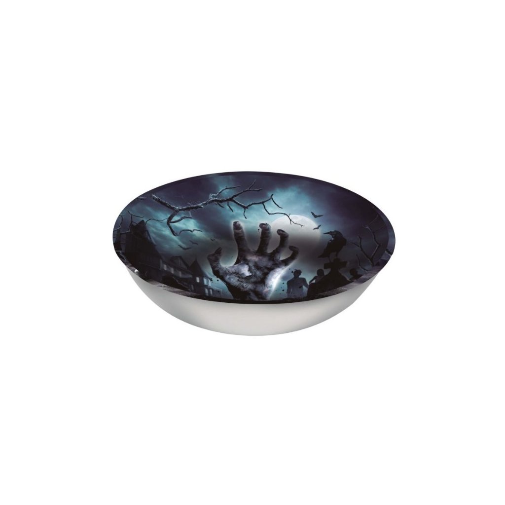 Plastová miska hřbitov - 27 x 9 cm. Plastová miska se strašidelným potiskem hřbitova budou nepostradatelným doplňkem každé Halloweenské party, tématické party nebo strašidelné party. Jsou také velmi praktické, misky po použití jednoduše umyjete a můžete jej znovu použít. Nevkládejte do myčky. Rozměr: 27 x 9 cm Balení: 1 ks.Doplňkové parametry