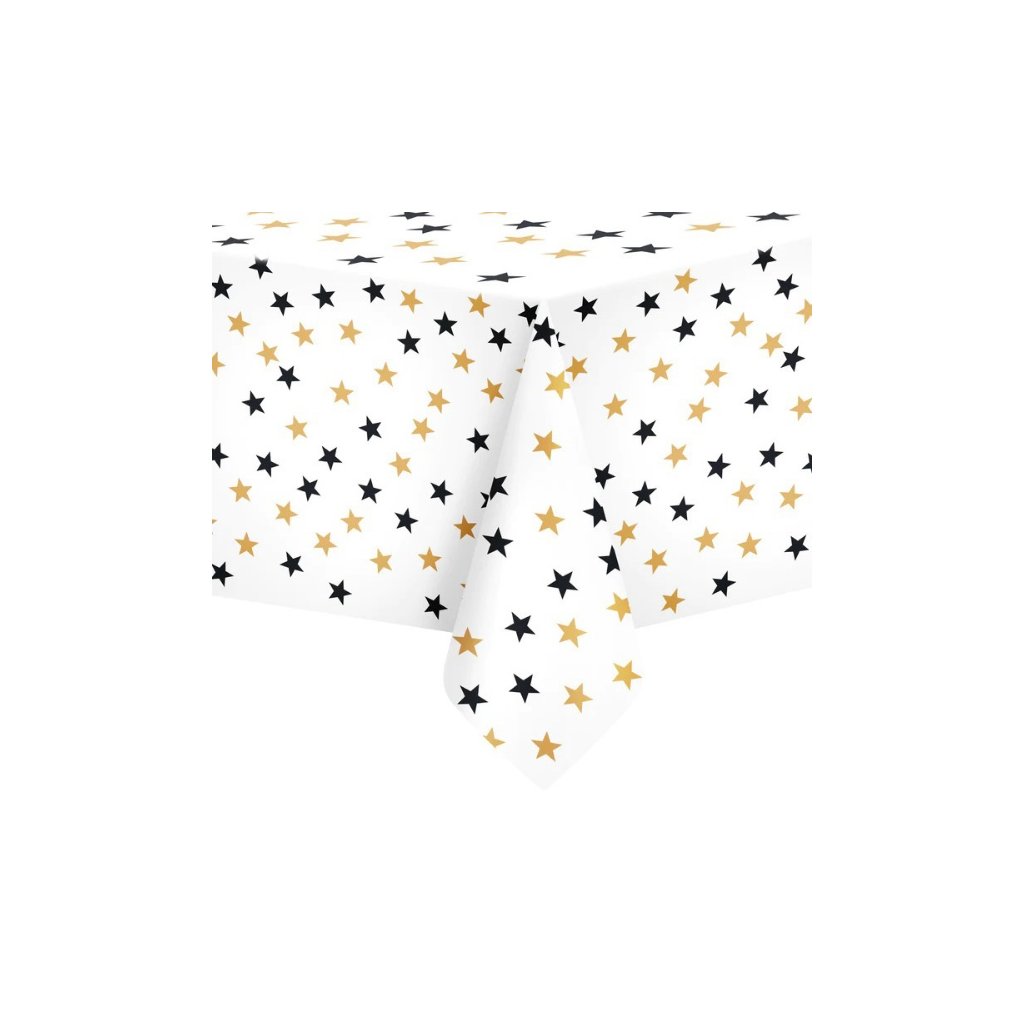 Bílý plastový ubrus s černými a zlatými hvězdičkami o velikosti 137 x 274 cm, vhodný jako dekorace i ochrana stolu na tematickou párty, oslavu narozenin i silvestrovský večer. Rozměry: 137 x 274 cmMateriál: PlastBalení: 1 ksDoplňkové parametry