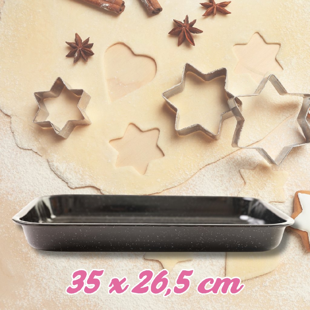 Rozměry: 34 x 26,5 x 5 cm – Perfektní velikost pro pečení různých druhů vánočního cukroví nebo menších pečiv.