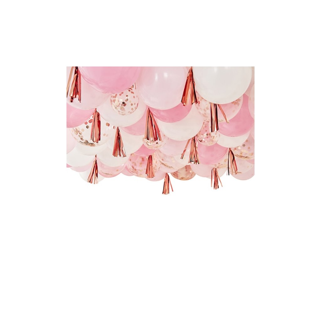 Sada na balonkový strop - Pink Blush se střapci. Dokonalá DIY sada balonků k vytvoření girlandy na strop. Vhodná na party ale i jakoukoliv oslavu narozenin, firemní večírek, silvestrovskou party ale i svatbu. Luxusní balonková dekorace během chvíle. Postupujte podle návodu a zrhuba za 30 minut ve dvou lidech budete mít ohromující balonkovou výzdobu. Praci Vám usnadní pumpička na balonky, kterou také naleznete v naší nabídce. Sada obsahuje: 160 ks 160 ks balónků ve velikosti 30 a 12 cm. Barvy růžová, bílá a průhledná s konfetami 15 ks střapčů v barvě rose gold, 15 m balonkové pásky, 100 lepíků dekorační drát.Doplňkové parametry