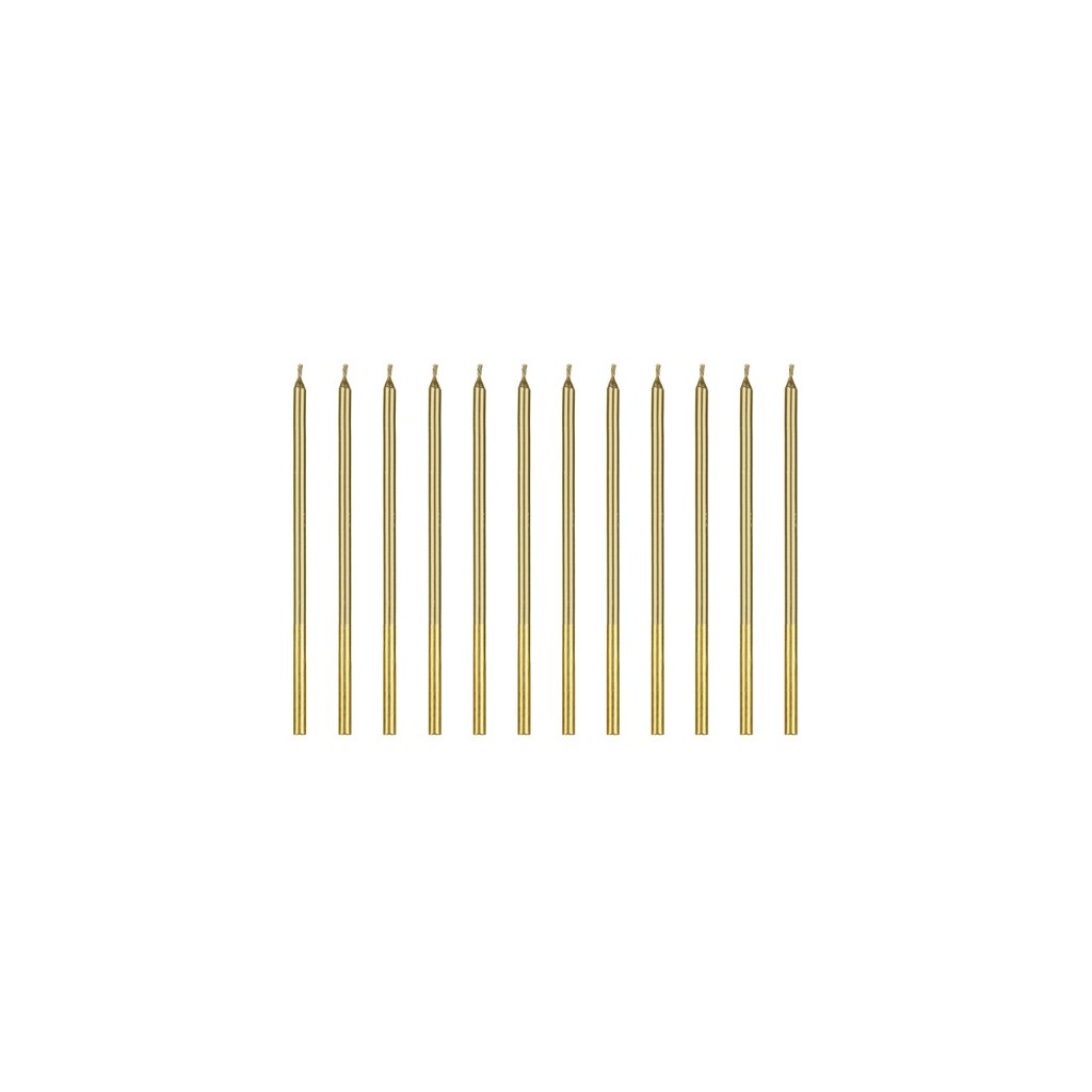 Svíčky zlaté 14 cm, 12 ks - Party Deco. Elegantní narozeninové svíčky by neměly chybět na žádném dortu na oslavě narozenin. Dolní část svíčky je přizpůsobená k zapíchnutí do dortu, takže není potřeba držátko. Rozměr: 14 cm. Balení: 12 ks.Doplňkové parametry