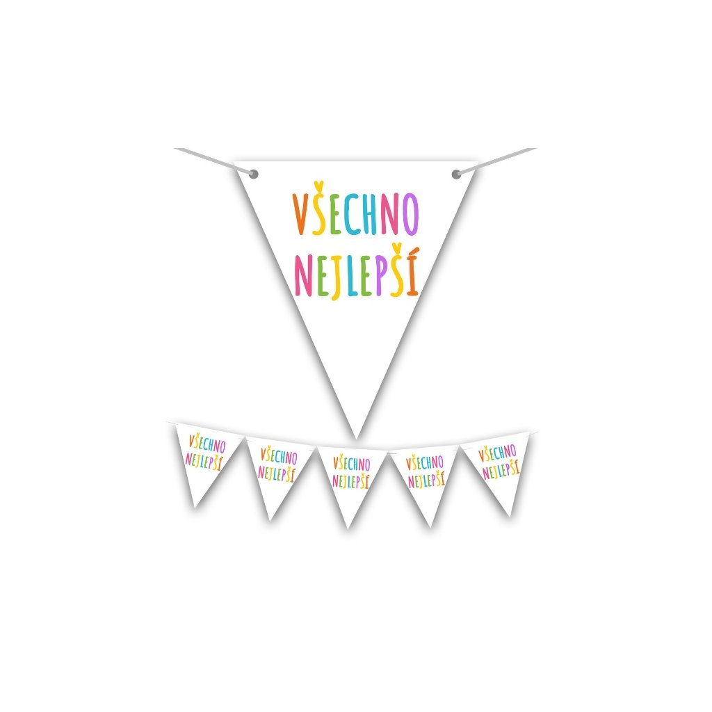 Papírová vlaječková girlanda s nápisem Všechno nejlepší. Girlanda obsahuje bílé vlaječky s duhovým nápisem Všechno nejlepší. Délka: 150 cm (200 cm včetně stuhy) Výška: 17 cm Balení: 10 vlaječek + stuhaDoplňkové parametry