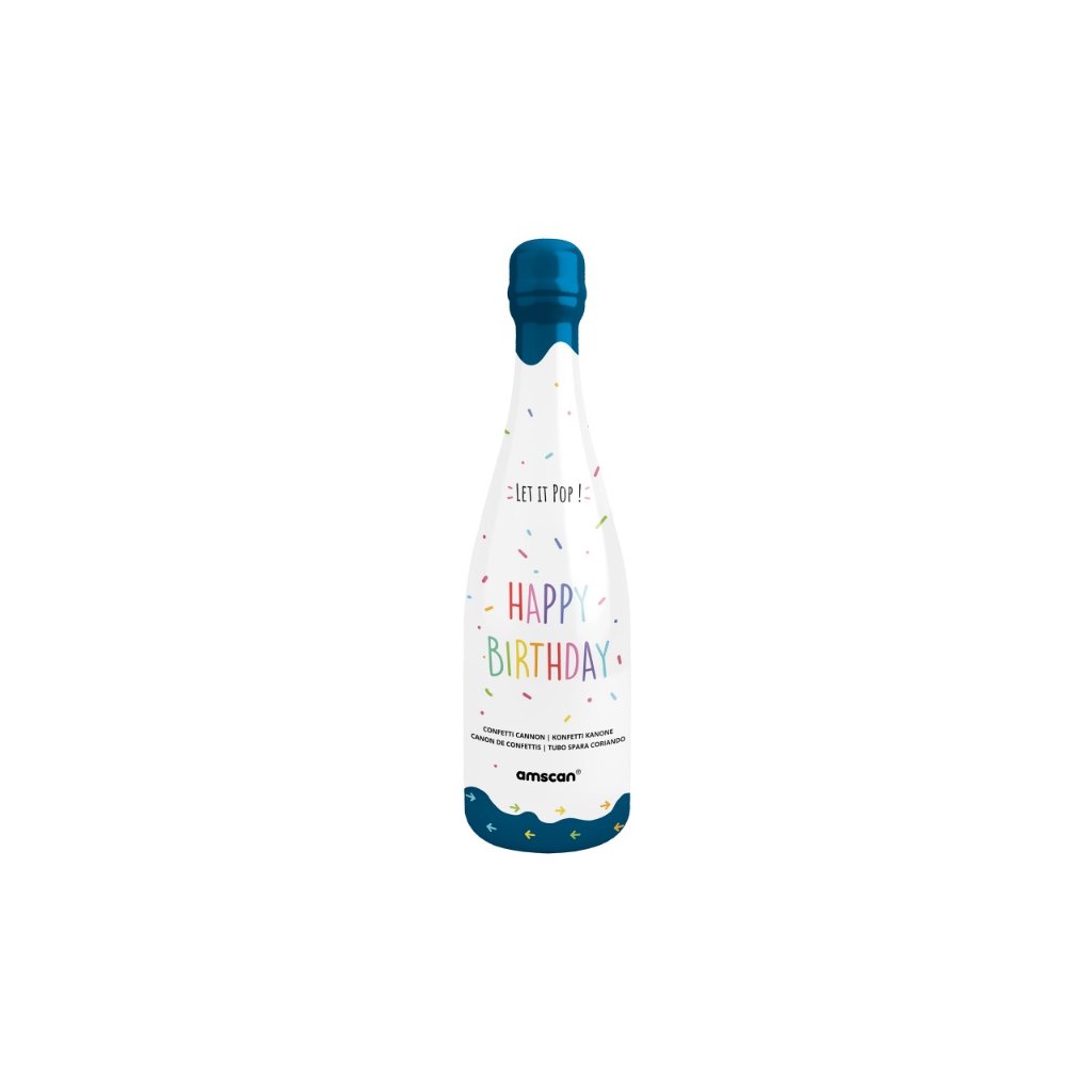 Vystřelovací konfety v modré lahvi šampusu, barevná kolečka, 32 cm /BP