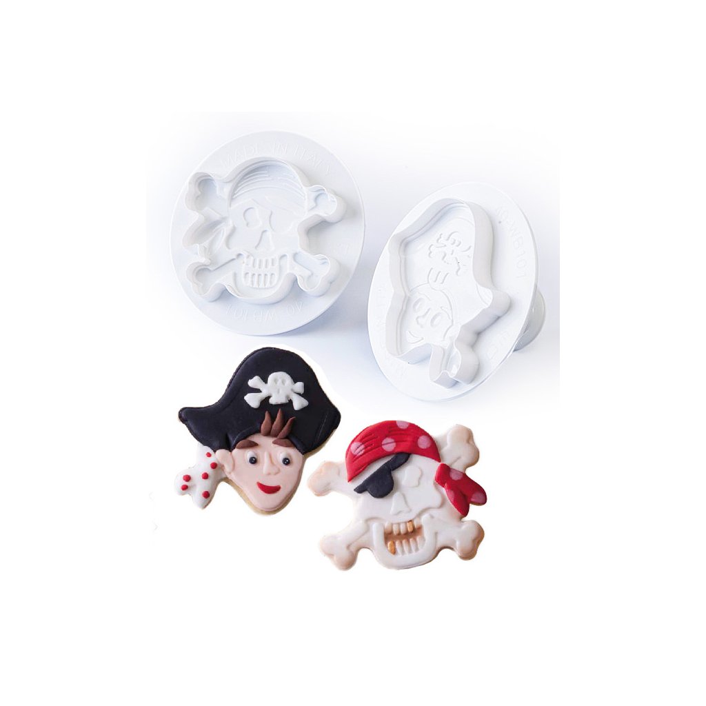 Plastové vykrajovátko s vytlačovačem na marcipán a cukrové hmoty. Sada obsahuje dva vytlačovače: motiv pirátská lebka a kapitán.